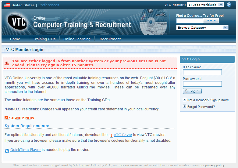 Unfortunately, we've found the VTC login system to be unduly restrictive. If you choose to use a training course, then close your browser window, and attempt to login again, you'll often get the message shown in Figure B.