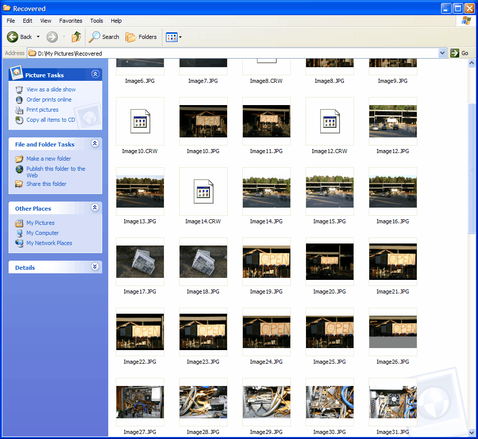 As you can see, PhotoRecovery found a whole bunch of photos on my formatted card. As it recovered the image, it wrote a copy of that file to my My Pictures folder, in a subfolder it called "recovered." Before running this program, make sure you've got enough hard-drive space to store a recovered mirror of the data you're looking for.
