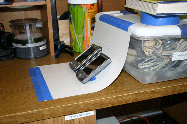 I also used my handy backdrop to shoot the tape image, above. You might notice a blue cast on the background, which I probably should have gotten rid of using Photoshop. Again, for the purposes of getting the article done on deadline, I just ignored it. Normally, I'd take another few minutes and either tune the camera's white balance or tweak the image in Photoshop, as I did with the Pocket PC shot.