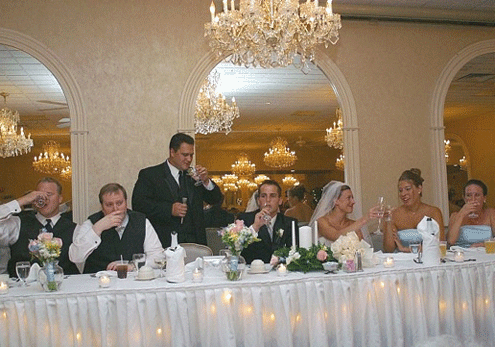 After everyone has pretty well stuffed their gullets, it will be time for the toasts. Be sure to get shots of all the toasts and the reaction of the wedding couple like the shot shown Figure F, and then it's cake-cutting time.